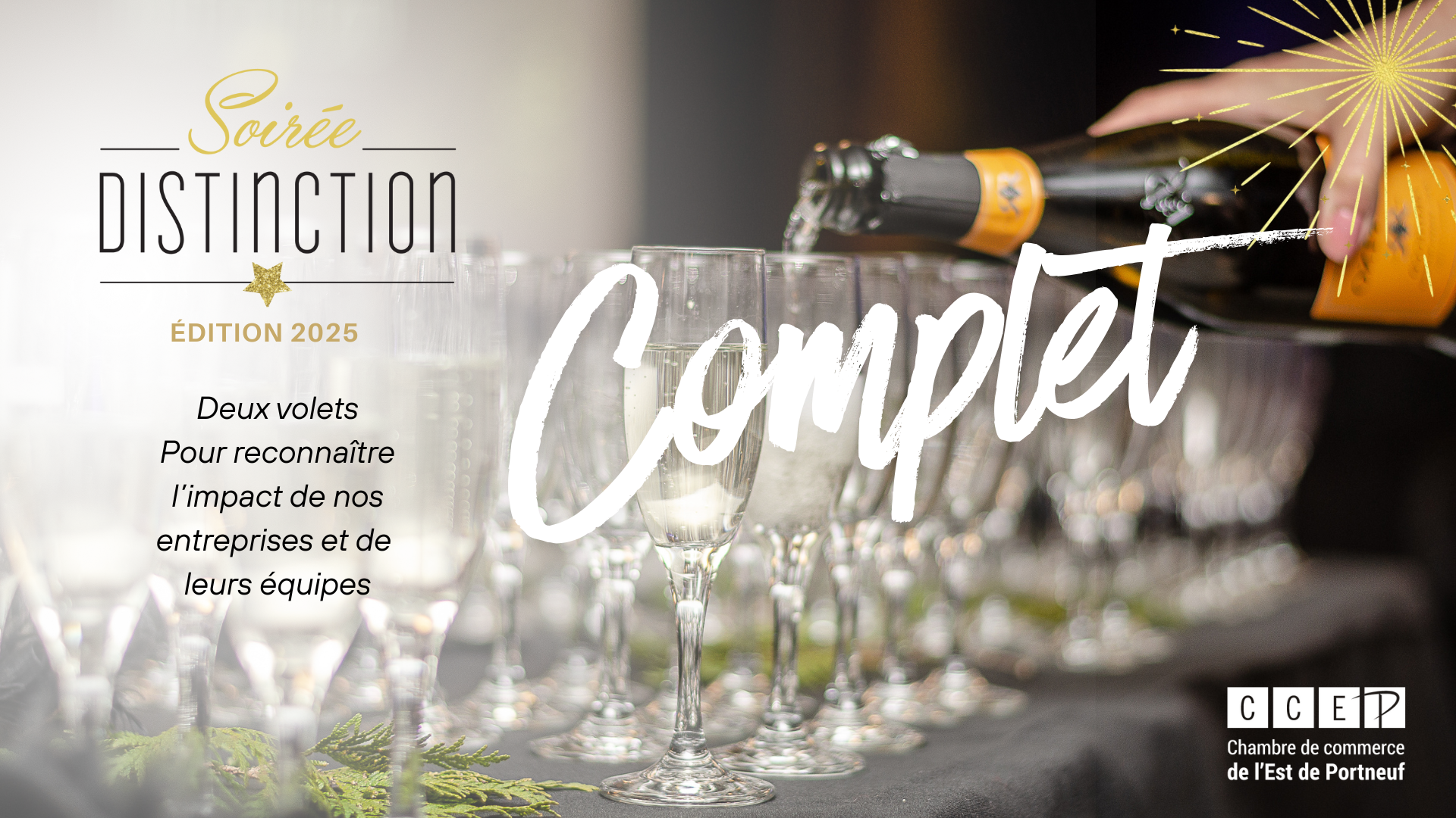 Soirée Distinction 2025Le 6 novembre prochain, venez célébrer l’excellence entrepreneuriale et le talent portneuvois lors d’une soirée élégante et festive organisée pour toute la MRC de Portneuf.Au programme :-Cocktail et réseautage avec plus de 200 leaders et entrepreneur-Un souper gastronomique 3 services-Cérémonie de reconnaissance des employé.e.s et entreprises qui se démarquent-Ambiance de gala, tenues de soirée recommandéesCette soirée est l’occasion parfaite de partager un moment de fierté, d’inspiration et de célébration dans une atmosphère raffinée.
